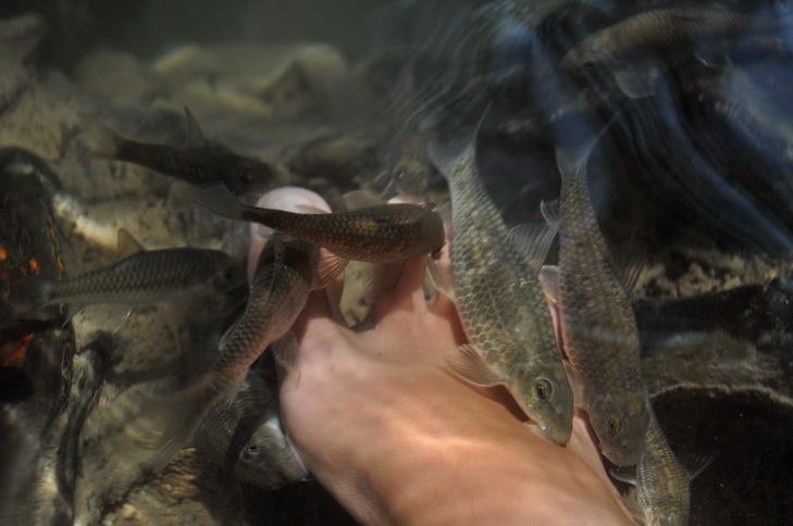 Za to Park Narodowy Erawan pierwsza klasa. Każdy z siedmiu poziomów wodospadów tworzy malownicze sadzawki w skałach wapiennych, nadając wodzie bajkowy kolor. A na płyciznach czekają rybki w stylu naszych akwariowych glonojadków, które z chęcią przysysają się do stóp trzymanych w wodzie i obgryzają skórę. Trzeba jednak przyznać, że nie jest to zabieg pielęgnacyjny w stylu tego, jaki zafundowaliśmy sobie w Kambodży, bo glonojadki są znacznie większe od tamtejszych rybek akwariowych i często nadgryzają zdrową skórę, zamiast obgryzać martwą. Stopy nie wyglądają więc jak po peelingu, a raczej jak po tarkowaniu.