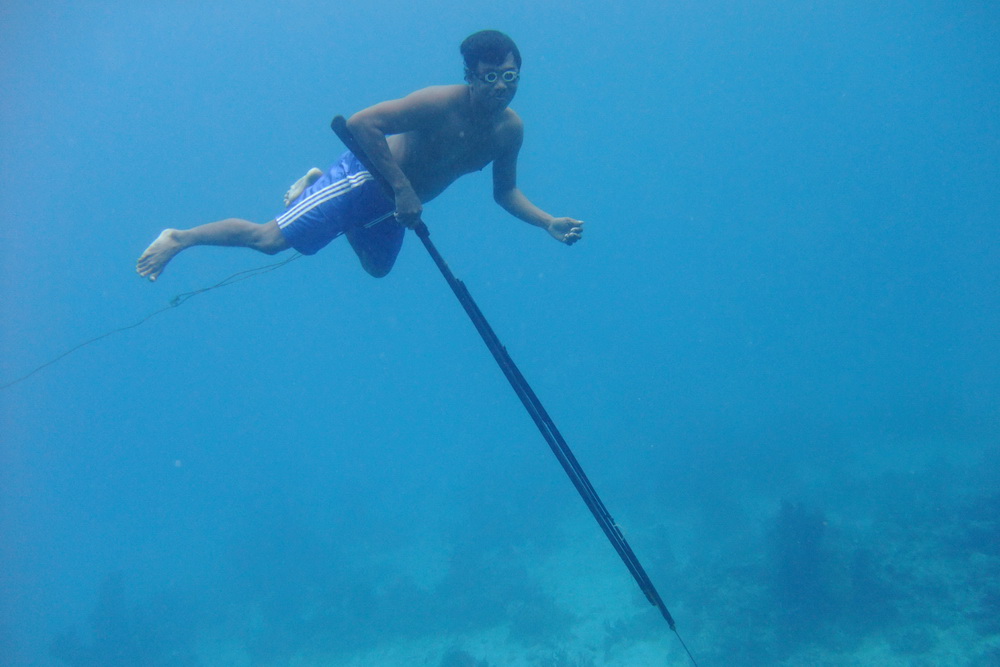 To co Bajo robią w wodzie z kuszą jest fascynujące. Aka schodzi na 10-12 metrów i traktuje morskie dno jak afrykańską sawannę. Najczęściej chwyta jakiś kamień, który służy mu jako balast i powolutku zakrada się do ryb i homarów, czając się za koralowcami. Spokojnie i dostojnie odbija się od dna niczym astronauta na księżycu i powoli zbliża się do celu. W jednej dłoni dzierżąc kamień, w drugiej kuszę, wstrzymuje oddech na 1 lub półtorej minuty i z mozołem przedziera się przez morską toń.