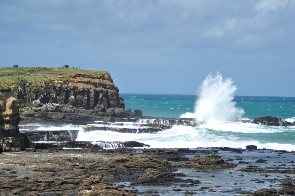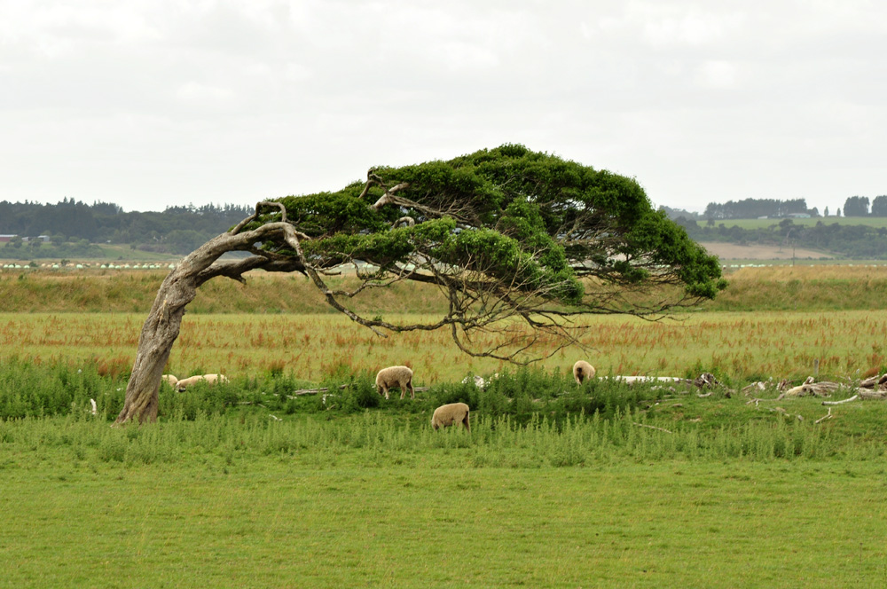 Na południowym krańcu Wyspy Południowej jest jeszcze gorzej. Drzewa rosną poziomo, a na klifach wystarczy rozpostrzeć bluzę i można zacząć szybować. Przez Catlins wiedzie Południowa Droga Widokowa. I faktycznie widoki są imponujące. Na wybrzeżu trzeba jednak mocno trzymać kierownicę, bo podmuchy są tak silne, że niejednokrotnie transportowały nam Żuka na sąsiedni pas. Całe szczęście ruch tutaj niewielki, więc czołówkę najłatwiej zaliczyć z testującymi wytrzymałość swoich pancerzyków sześcionogimi kamikadze.